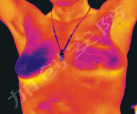 ←乳腺癌大多数乳腺癌的热图像是有明显的不对称性,患侧的乳房热图像呈明显的局部性热区,乳晕周围也出现明显的高温. |